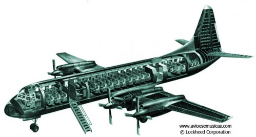 Vista da porta traseira esquerda do Electra olhando para a frente do avião