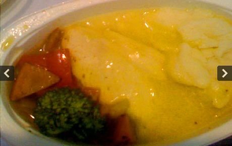 Agora, sei o que você está pensando. Você está pensando que é mais um pouco daquele creme de confeiteiro que veio com o baaji. Admito que pensei a mesma coisa, mas não era. Era mostarda, Richard. MOSTARDA. Mais mostarda do que qualquer homem conseguiria consumir em um mês. À esquerda, temos um pedaço de brócolis e uns pimentões num óleo marrom que parece cola; à direita, o chef preparou um pouco de purê de batatas. Obviamente, o amassador de batatas estava quebrado, então se decidiu que a melhor alternativa seria passar as batatas pelo trato digestivo de um pássaro.