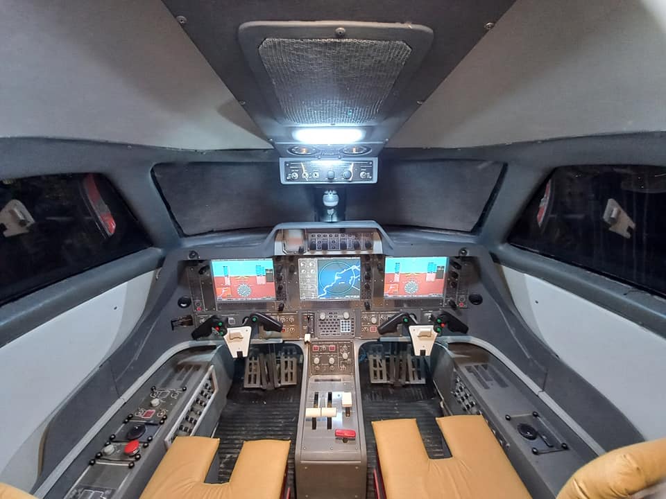 Na cabine de passageiros, poltronas imitam o avião real. No entanto, é a cabine de comando que impressiona. Sabe o manche em gaivota dos aviões da Embraer? Está lá. Sabe as telas touch screen dos Phenom? Também estão ali. Todos os detalhes da cabine de comando foram reproduzidos de forma bem fiel. O trabalho ficou tão bem feito que técnicos da Embraer foram visitar a casa de Geraldo. Além do reconhecimento, levaram presentes ao fã.