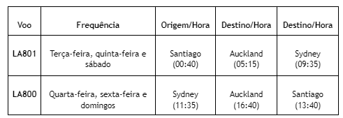 Os voos para Oceania, estão programados a partir de 29 de março, e serão operados às terças, quintas e sábados à 0h40, chegando em Auckland às 5h15 e Sydney às 9h35. Na volta, às quartas, sextas e domingo, o Dreamliner decola de Sydney às 11h35 e segue para Auckland, às 16h40 o 787 decola com destino a Santiago com pouso previsto às 13h40 (horário local)