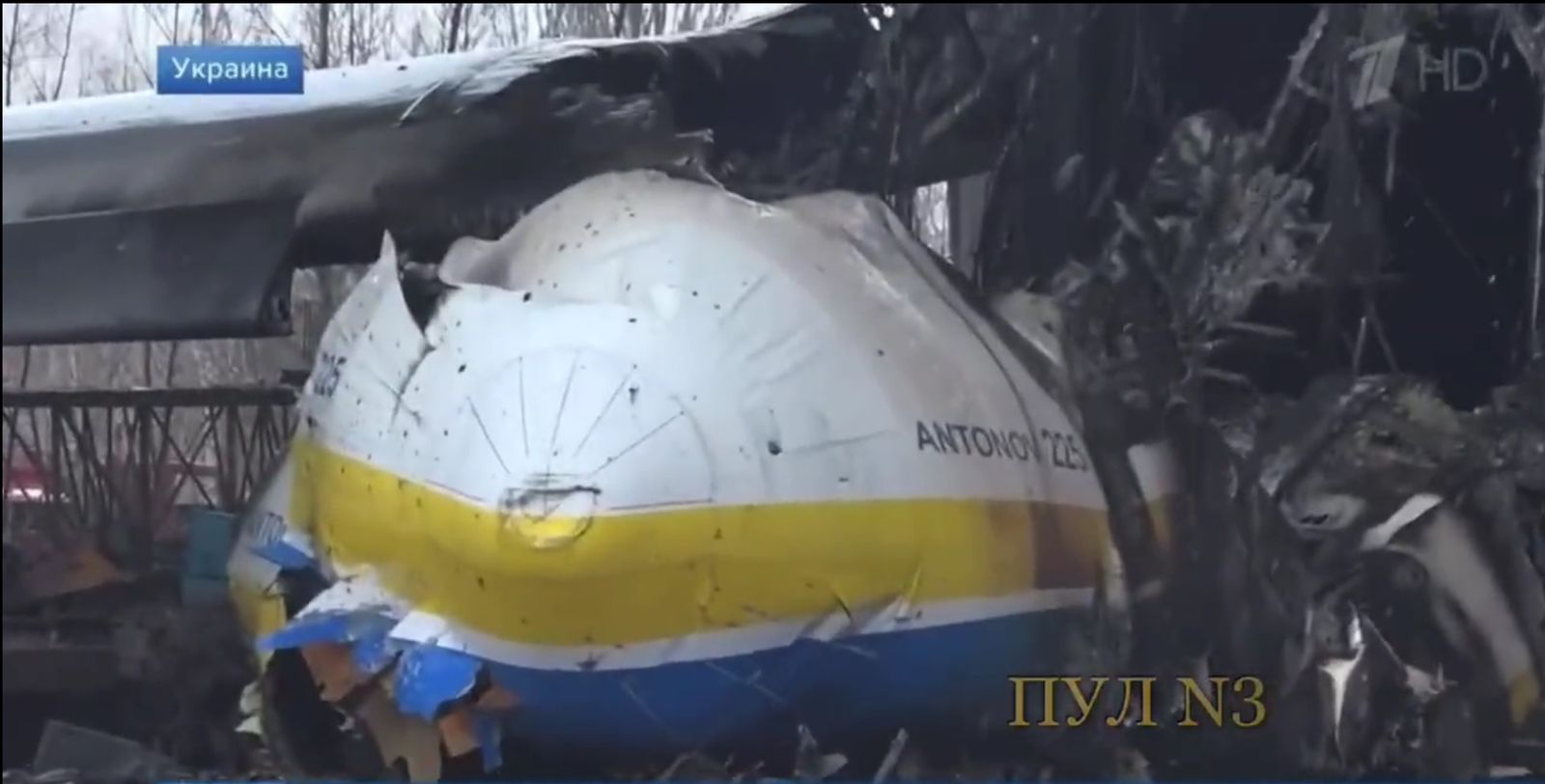 Nesta sexta-feira (04), a TV estatal russa Pervi Kanal, mostrou imagens do Aeroporto de Hostomel também conhecido como Gostomel (GML) que mostram imagens do Antonov AN-225 Mriya destruído.
