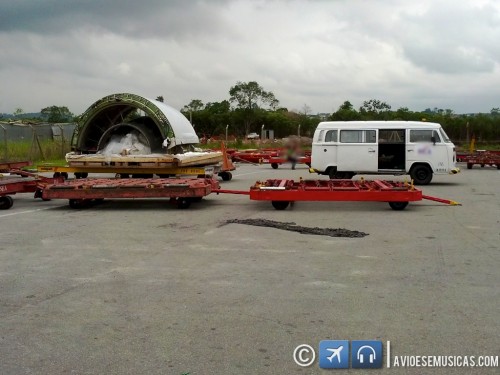 Agora olhem a foto 3 abaixo: o que está em cima do “dolly” é APENAS METADE da parte de trás do motor do 777, o cowling do reversor (que na foto 2 acima é o que está atrás da capota que está aberta).
