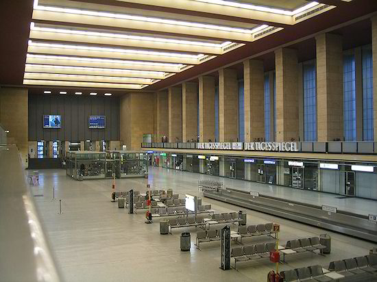 Berlim foi uma das primeiras grandes cidades europeias a terem um aeroporto e voos comerciais regulares, com o aeroporto de Tempelhof (pronuncia-se têmpel-hôf, com o “H” aspirado e o resultado proparoxítono), inaugurado em 1923 e com um novo terminal inaugurado em 1934 que é uma obra-prima e um clássico da arquitetura moderna (o projeto foi de Albert Speer, o arquiteto oficial do nazismo, mas que apesar de sua afiliação maligna é até hoje respeitado como um gênio em sua área – tanto que até o insuspeito e respeitadíssimo ícone da social-democracia alemã, o ex-chanceler e Prêmio Nobel da Paz Willy Brandt, lutou pela sua libertação da prisão). Tempelhof tinha um projeto muito interessante e ousado, com uma pista de taxiagem circular em volta da pista de pouso (uma segunda pista paralela foi construída na época do Bloqueio de Berlim). No tempo em que os aviões eram menores e não havia jatos nem jet bridges, o embarque e desembarque eram feitos em um imenso hangar coberto, protegendo os passageiros das intempéries. Tempelhof foi um projeto revolucionário, histórico e um dos mais belos aeroportos já construídos, como vocês poderão ver nas fotos a seguir: