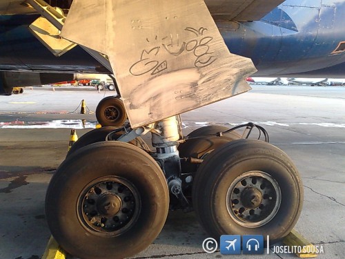 Já faz um tempo que tirei esta foto, como eu estou organizando todo o acervo ela apareceu aqui e resolvi postar. Nesta época, era comum ver algumas frases “mal educadas” nas saias do trem de pouso e também nas portas dos porões de carga.