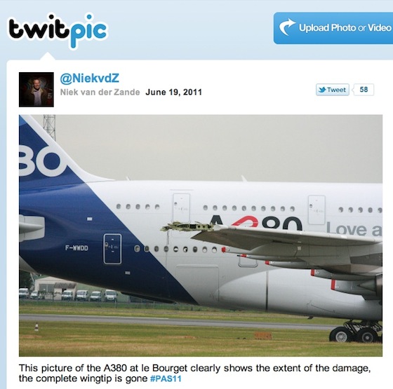 O ruim é que a colisão de ontem aconteceu no show aéreo de Paris e os danos foram tantos que todas as apresentações do A380 foram canceladas e pra piorar ainda mais, o principal concorrente (o Boeing 747-8i) está lá pronto pra angariar compradores e virou a estrela do show na casa do adversário.