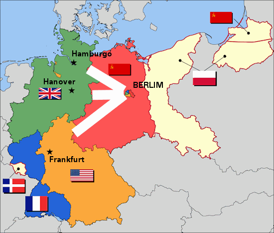 Os setores de ocupação da Alemanha em 1947. As duas áreas amarelas a leste foram incorporadas à Polônia e à URSS. A área rosa é a zona de ocupação soviética, que virou a Alemanha Oriental; vê-se Berlim no meio dela, também dividida em quatro setores, e os três corredores aéreos que a ligavam às zonas de ocupação a oeste (britânica, francesa e americana), que mais tarde viraram a Alemanha Ocidental. A pequena área amarela a oeste é o Sarre, protetorado francês que mais tarde seria incorporado à Alemanha Ocidental.