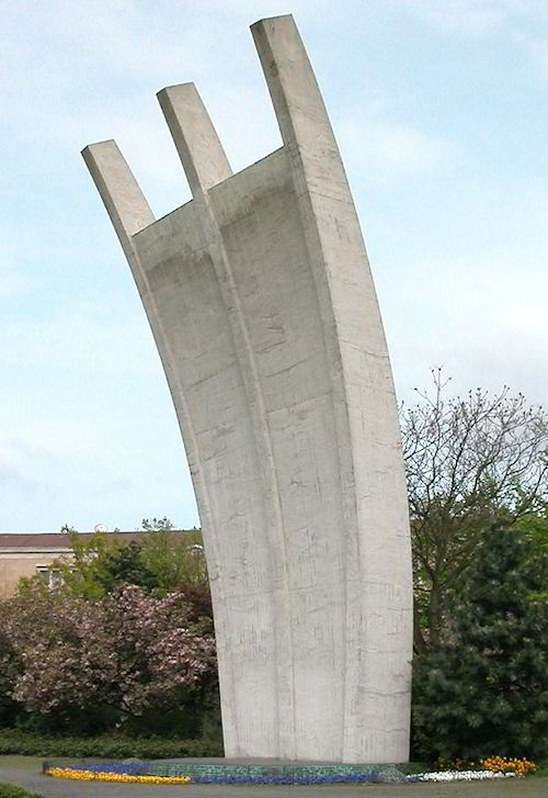 Monumento à Ponte Aérea no aeroporto de Tempelhof (hoje fechado), em Berlim. Há monumentos semelhantes em Frankfurt e em Celle, perto de Hanover, onde havia uma base da RAF. Os três eixos simbolizam os três corredores aéreos por onde a cidade era abastecida.