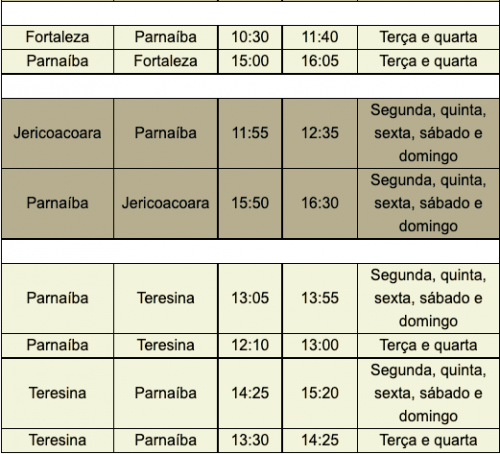 Partindo de Jericoacoara para Parnaíba os voos serão realizados às segundas, quintas e sextas-feiras, aos sábados e domingos. Já a operação entre as cidades do estado de Piauí, Parnaíba e Teresina, acontecerá diariamente, com ida e volta no mesmo dia.
