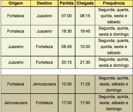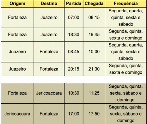 Os voos partindo de Fortaleza com destino a Juazeiro do Norte ganham novos horários e frequências a partir de 11 de fevereiro. A operação passa a acontecer seis vezes por semana, às segundas, quartas, quintas e sextas-feiras, aos sábados e domingos, com duas possibilidades de ida, com decolagem às 07h e às 18h30 e com duas opções de retorno saindo de Juazeiro do Norte, às 08h45 ou 20h15.